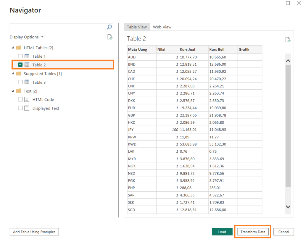 Klik Transform Data untuk mengolah tabel data yang kita ekstrak.