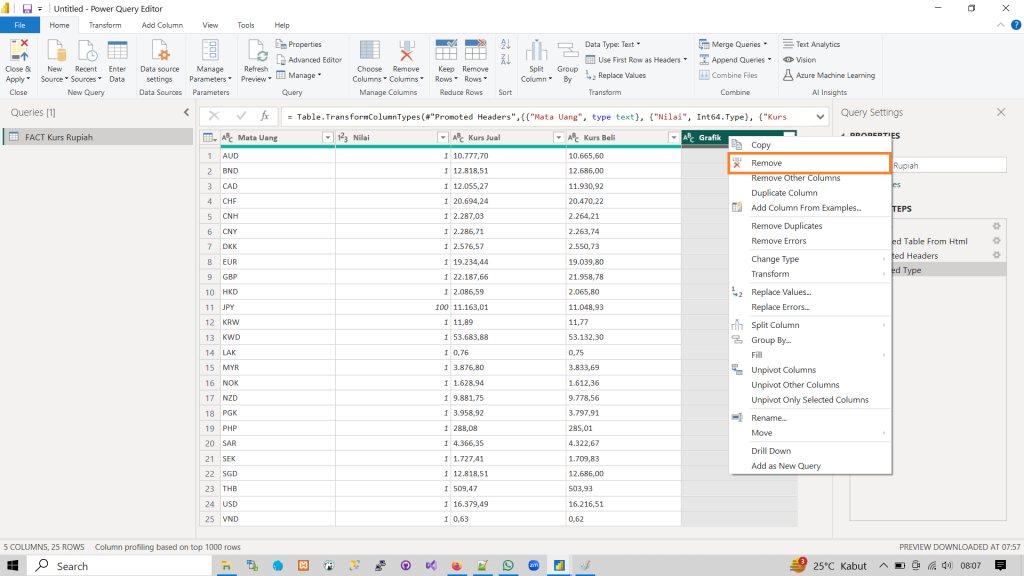 Setelah tampil halaman Power Query Editor, sekarang kita rapikan datanya. Hapus kolom Grafik karena ini tidak diperlukan.