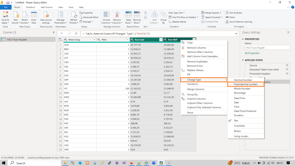 Kemudian kita ubah tipe data Kurs Jual dan Kurs Beli menjadi Fixed Decimal Number (tipe data mata uang). Caranya: pilih kedua kolom tersebut (tekan tombol Control/Ctrl saat memilih), klik kanan dan pilih Change Type → Fixed Decimal Number.