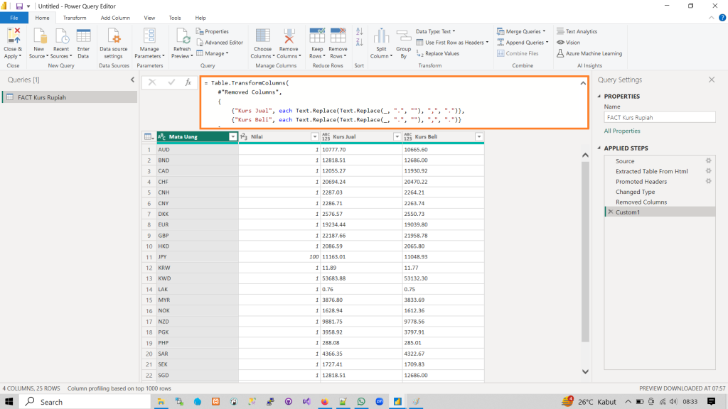 Kita lihat kolom Kurs Jual dan Kurs Beli masih menggunakan tipe data Text, yang seharusnya mata uang (Fixed Decimal Number). Kolom ini menggunakan pemisah ribuan dan desimal. Perlu diperhatikan: apakah setting bahasa Power BI kita menggunakan Bahasa Inggris atau Bahasa Indonesia. Apabila Bahasa Indonesia (pemisah ribuan dengan titik, desimal dengan koma), maka bisa langsung ubah tipe datanya. Namun, apabila Bahasa Inggris, maka perlu diubah sebaliknya: pemisah ribuan dengan koma, desimal dengan titik.